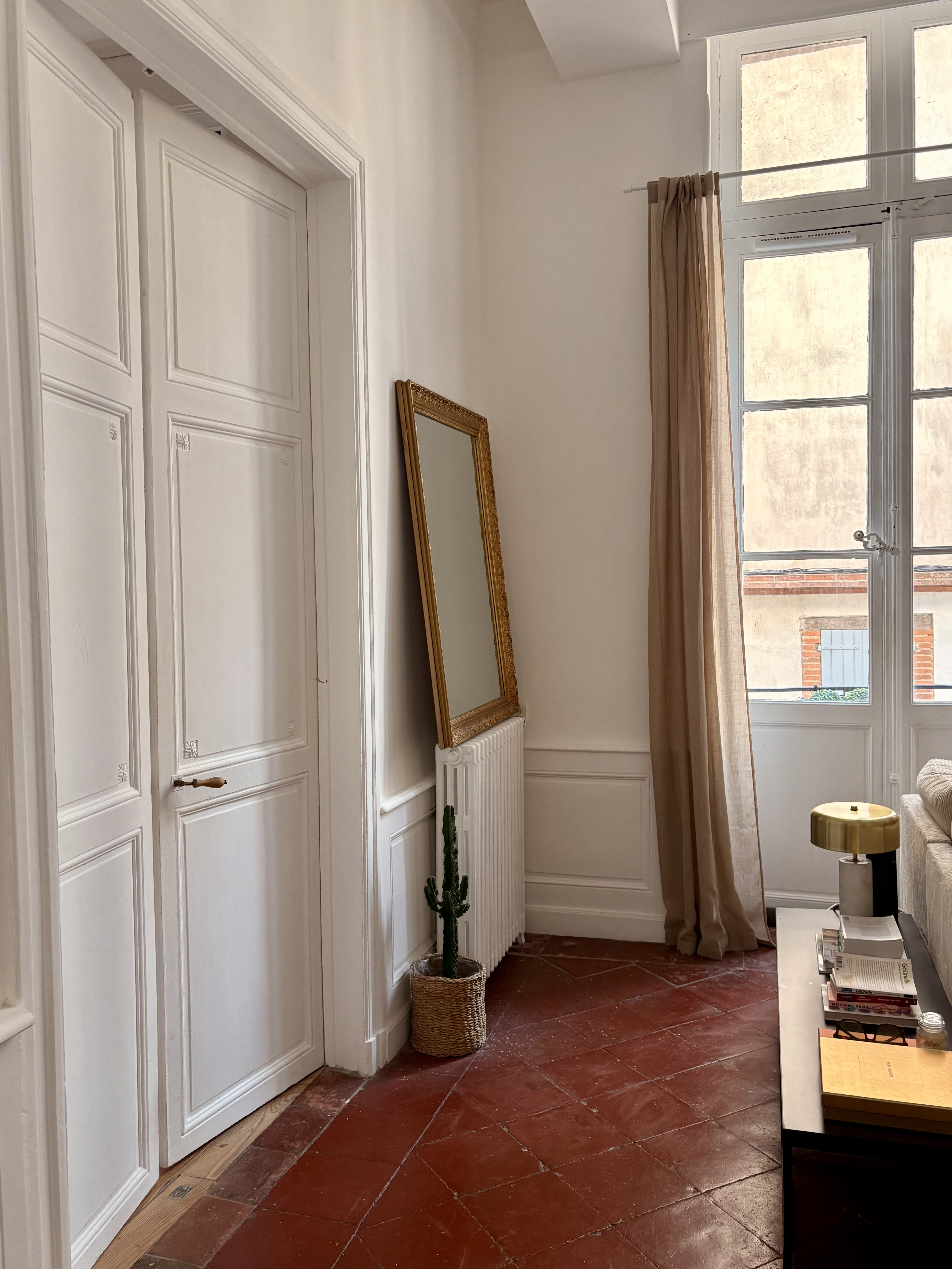 Il se compose d'un séjour agréable avec coin cuisine ouvert, d'une chambre, d'une salle de bain, de toilettes séparées et d'un cellier pratique. Le séjour et la chambre sont agrémentés d'une cheminée décorative, et les tommettes anciennes ainsi que les portes-fenêtres renforcent le charme de l'appartement.