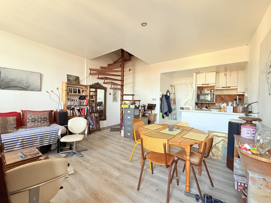 Salon lumineux avec cuisine ouverte, petit extérieur parfait pour un café, un verre ou une cigarette au soleil.
