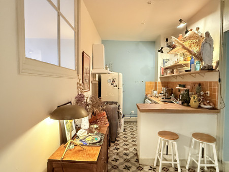 Il se compose d'une entrée avec de jolis carreaux de ciment, d'un salon/salle à manger ouvert sur une terrasse, d'un coin cuisine à réaménager, d'une salle de bain, d'un cellier et de deux chambres.