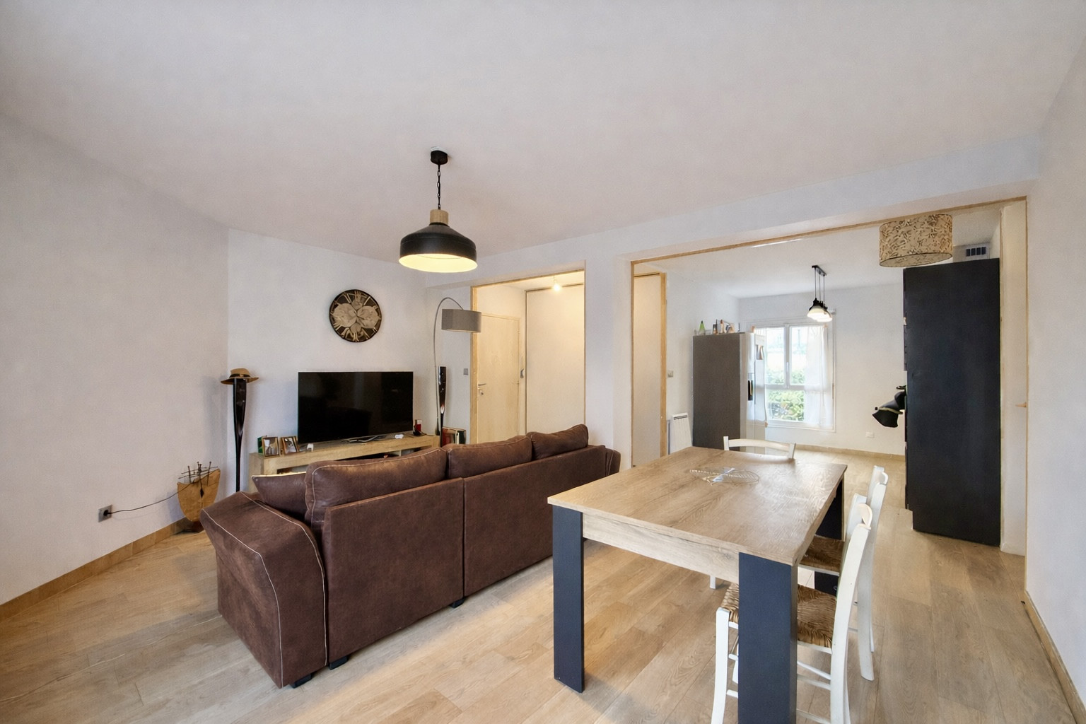 La pièce de vie se compose d’un salon lumineux avec CUISINE OUVERTE, formant un espace convivial, avec un accès direct sur la terrasse et les espaces verts de la copropriété.
