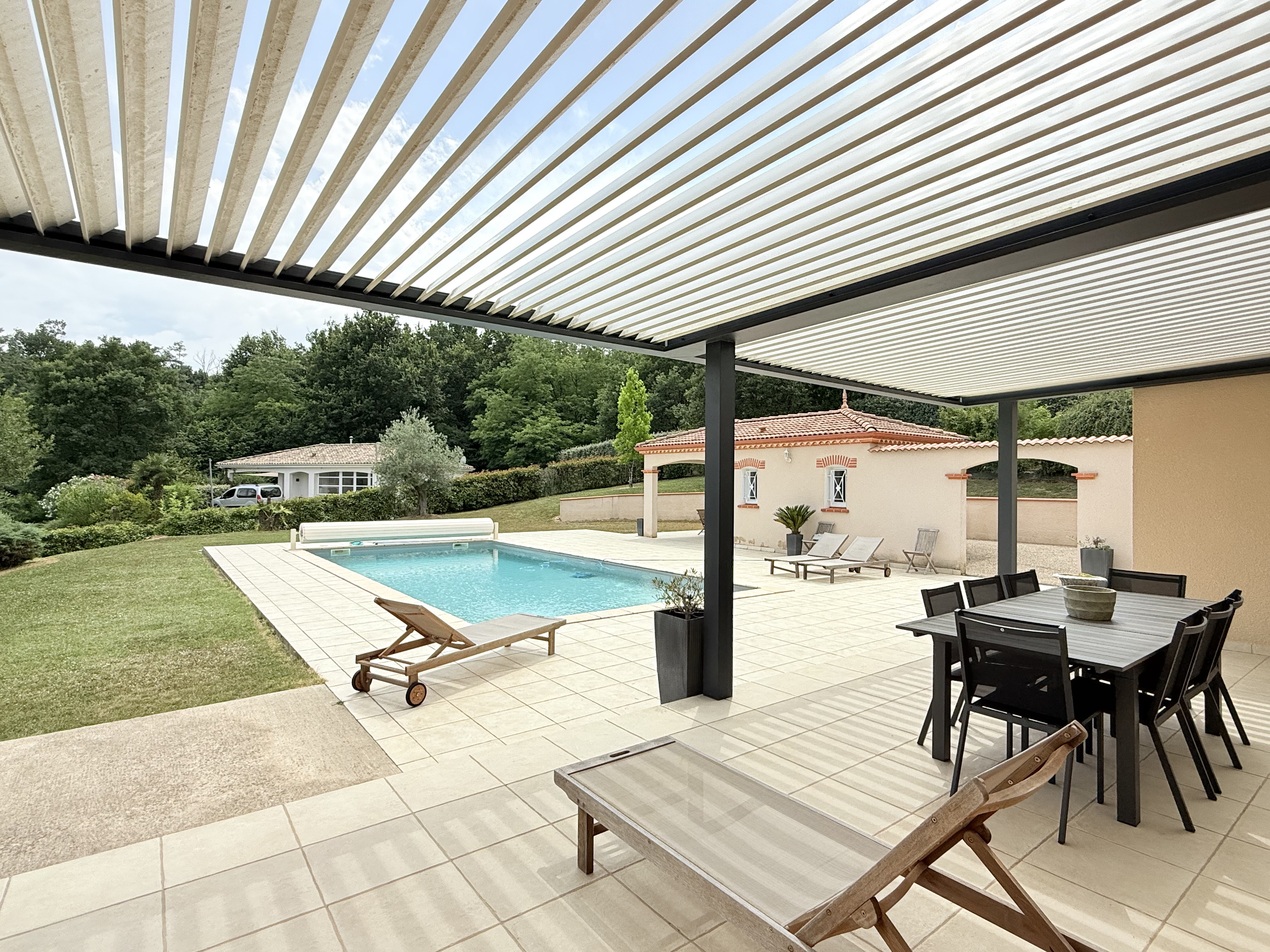 Le terrain d'environ 2 000 m², joliment arboré et doté d'un système d'arrosage intégré, nécessite peu de temps de jardinage. Il est également agrémenté d'une terrasse bioclimatique parfaite pour profiter du cadre en toute saison.